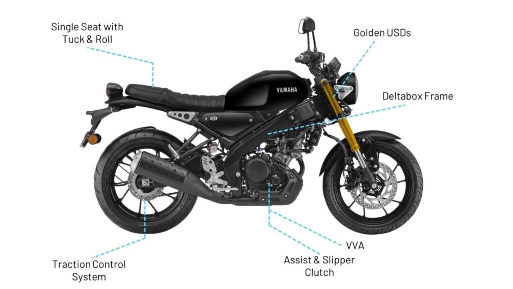 For safety and rider assistance, the XSR155 comes standard with disc brakes at both ends, governed by dual-channel ABS and a Traction Control System (TCS), a premium safety net in the sub-200cc class.